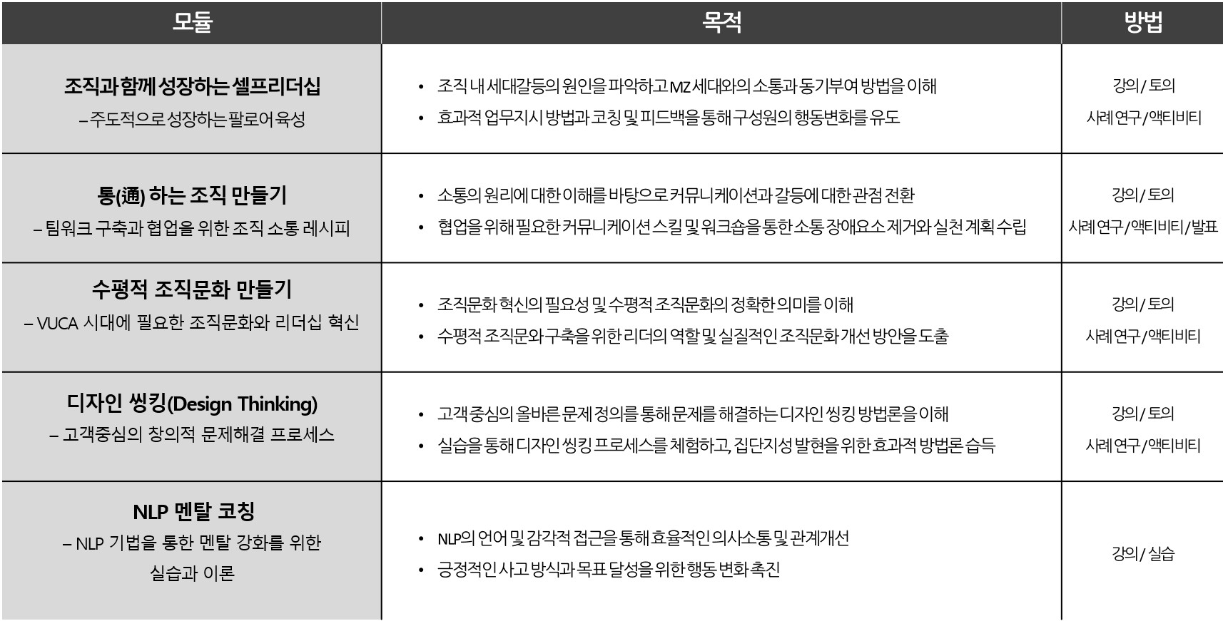 · 정의 : 조직의 미션, 비전, 핵심가치에 대한 정확한 인식을 토대로 리더십, 직무역량과 연결시켜 조직 총체적인 역량을 개발하고 강화하는 강의, 토론, 실습 형태의 교육 입니다.